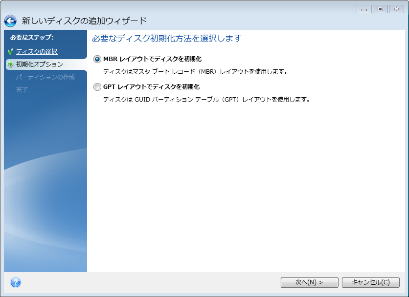 Acronis True Image 2015 は MBR と GPT の両方のパーティショニングに対応しています。GUID パーティション テーブル(GPT)は、ハード ディスクの新しいパーティショニング方法であり、従来の MBR よりもパーティショニング方法として優れています。オペレーティング システムが GPT ディスクをサポートする場合、新しいディスクを GPT ディスクとして初期化することを選択できます。