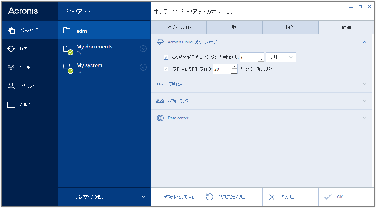 Acronis Cloud のクリーンアップ設定を構成して、その容量の使用率を最適化します。