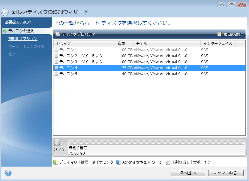 コンピュータに追加したハードディスクを選択します。複数のハード ディスクを追加した場合は、そのうちの 1 台を選択し、[次へ] をクリックして先に進みます。後で、新しいディスクの追加ウィザードを起動し、別のディスクを追加することもできます。