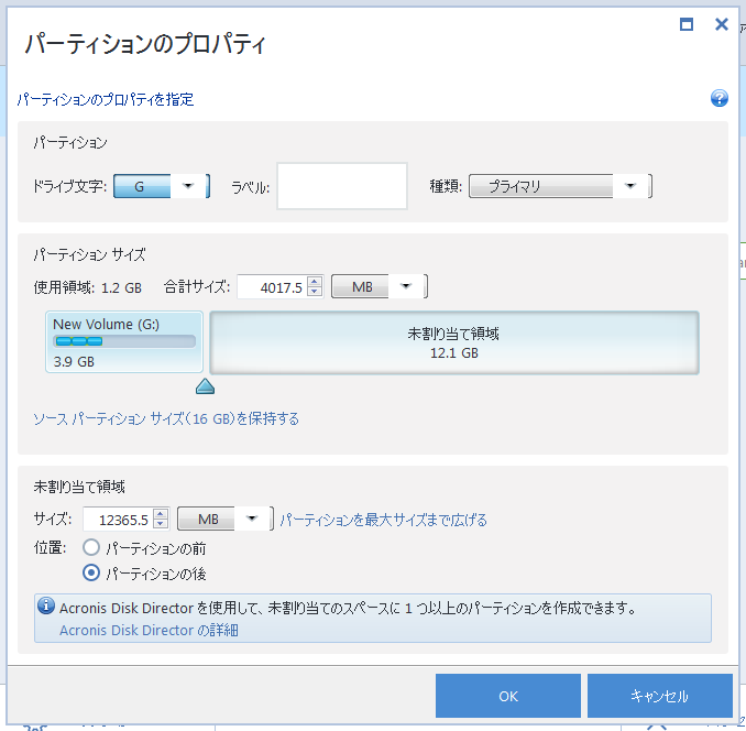 パーティションのサイズを変更した後、残りのパーティション用として必要な未割り当て(空き)領域を残しておく必要があることに注意してください。ドライブとパーティションの種類を選択します。設定を終了したら、[OK] をクリックしてその設定を確定し、[ディスクの復元] メイン ウィンドウに戻ります。