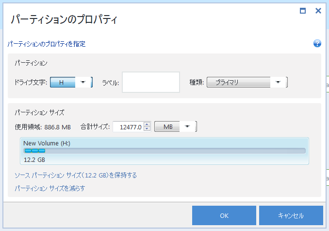 - [パーティションのプロパティ] リンクをクリックし、パーティションの設定を行います。ドライブとパーティションの種類を選択します。設定を終了したら、[OK] をクリックしてその設定を確定し、[ディスクの復元] メイン ウィンドウに戻ります。