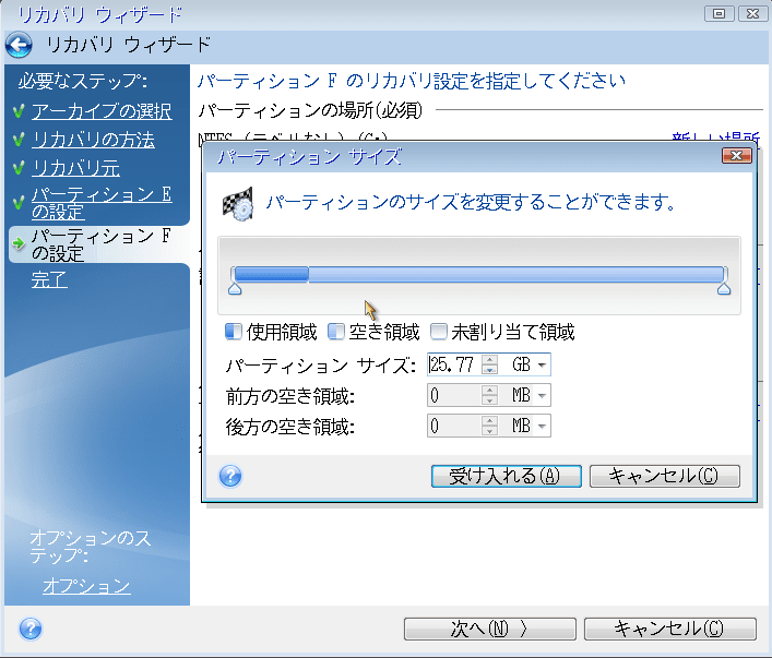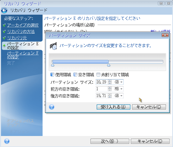 - サイズ - [パーティションサイズ] の領域で [デフォルトを変更] をクリックします。デフォルトでは、新しいディスク全体がパーティションに使用されます。[パーティションサイズ] フィールドに正しいサイズを入力します(この値は [リカバリ元] の手順で確認できます)。次に、必要に応じて、[バックアップ情報] ウィンドウに表示されていた場所と同じ場所に、このパーティションをドラッグします。[確定] をクリックします。