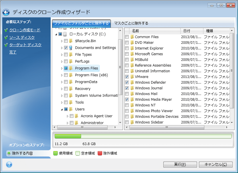 ソースディスクから特定のファイルのクローンを作成しない場合は(たとえば、宛先ディスクがソースディスクよりも小さい場合)、除外するものステップで、除外するものを選択できます。