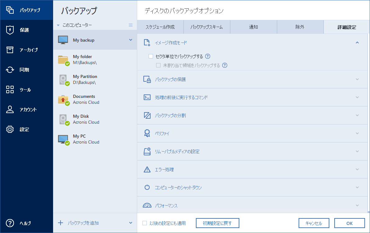 製品の初回インストール後に変更したオプションをすべてリセットする場合は、[初期設定にリセット] ボタンをクリックします。これにより現在のバックアップの設定のみがリセットされることに注意してください。今後のすべてのバックアップでの設定をリセットするには、[初期設定にリセット] をクリックし、[設定をデフォルトとして保存する] のチェックボックスをオンにしてから、[OK] をクリックします。