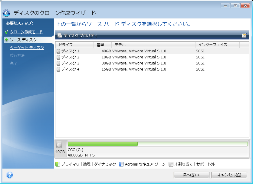 このウィンドウに表示される情報(ディスク番号、容量、ラベル、パーティション、およびファイル システムの情報)を参照して、移行元と移行先を決定することができます。パーティションを持つディスクが複数検出されたときは、ソース ディスク(つまり、古い方のデータ ディスク)を指定するためのウィンドウが表示されます。