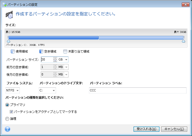 変更するには、[前方の空き領域]、[パーティション サイズ]、[後方の空き領域] の各フィールドに値を入力するか、パーティションの境界またはパーティション自体をドラッグします。