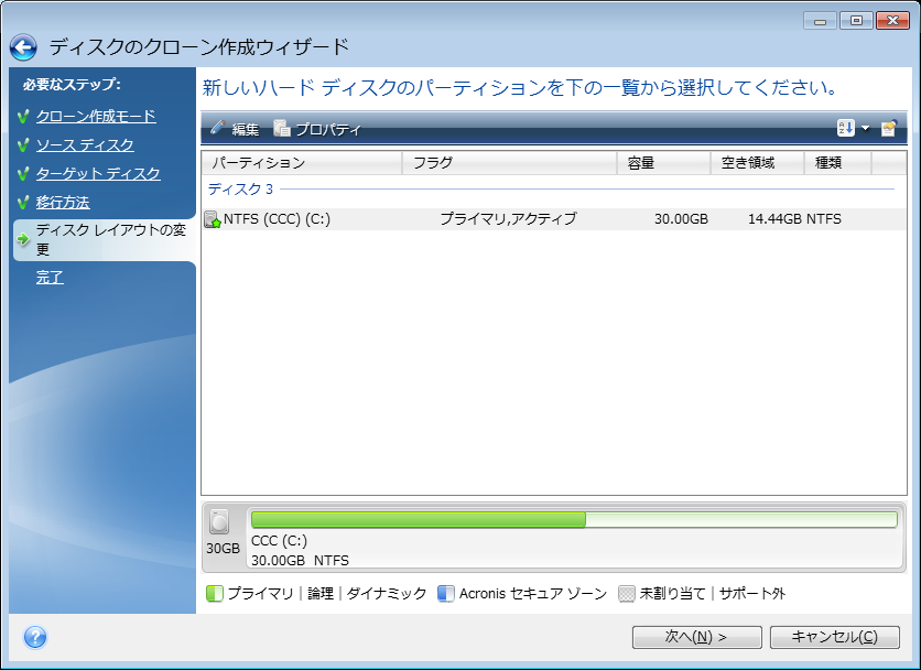 このウィンドウには、移行元のハードディスクを表す四角形と、各ディスクのパーティションおよび未割り当て領域、および新しいディスク レイアウトが表示されます。