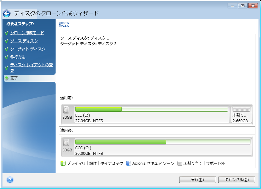 システム用に使用されていないディスク、または現在アクティブになっていないオペレーティング システムを含むディスクのクローン作成では、再起動の必要はありません。[実行] をクリックすると、元のディスクから新しいディスクへのクローン作成処理が開始し、別のウィンドウに進行状況が表示されます。[キャンセル] をクリックすると、処理は中止されます。キャンセルした場合は、新しいディスクにパーティションを再作成してフォーマットするか、クローン作成の手順を繰り返す必要があります。クローン作成処理が完了すると、結果メッセージが表示されます。