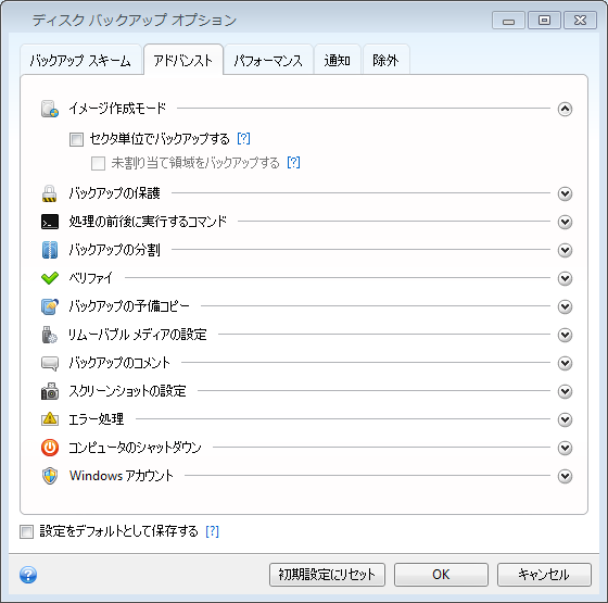 アプリケーションをインストールすると、すべてのオプションは初期値に設定されます。これらのオプションは、現在のバックアップ処理のためだけに変更することも、今後のすべてのバックアップ向けに変更することも可能です。[設定をデフォルトとして保存する] チェックボックスをオンにすると、変更した設定が今後のバックアップ作業すべてにデフォルトで適用されます。