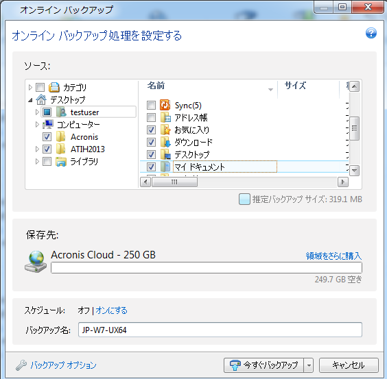 Acronis Cloud へのバックアップ