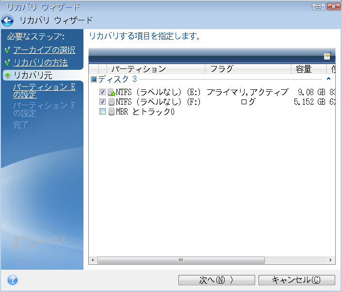説明しているこの事例(システム予約済みパーティションのリカバリ)では、手順 10~12 は実行しなくてもかまいません。PC の製造元が作成した隠しパーティションをリカバリする場合は、これらの手順を実行する必要があります。