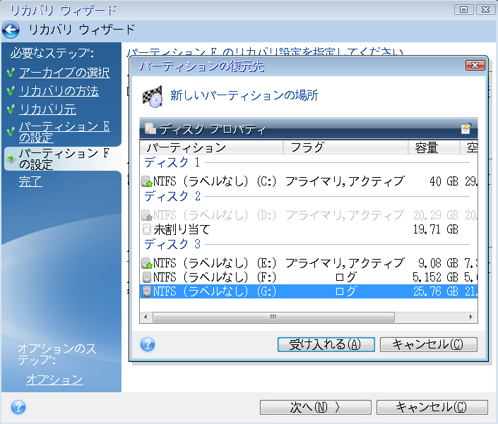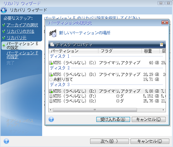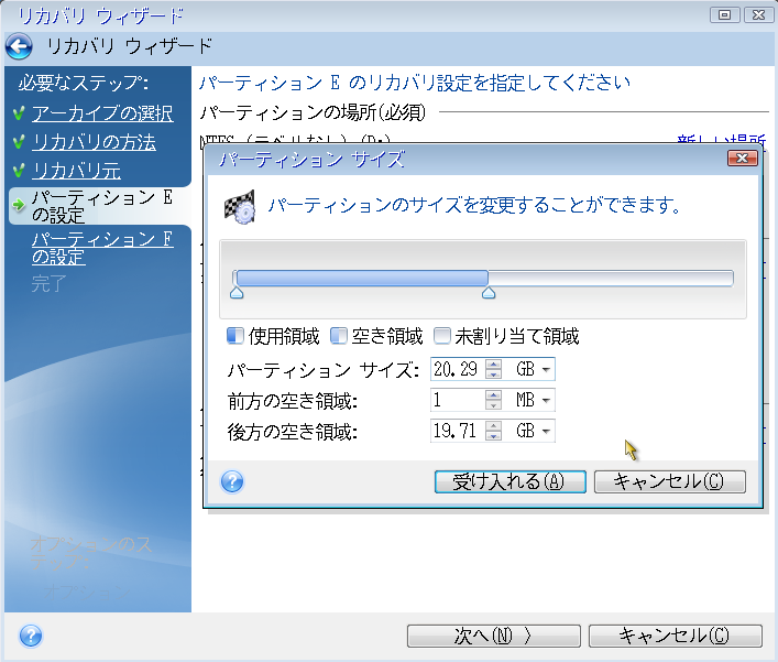 パーティションを選択すると、該当する [パーティションの設定...] の手順が表示されます。これらの手順は、ドライブ文字のないパーティション(隠しパーティションには通常、ドライブ文字はありません)から開始します。次に、パーティションのドライブ文字の昇順に進みます。この順序は変更できません。この順序は、ハードディスク上のパーティションの物理的順序とは異なる場合があります。