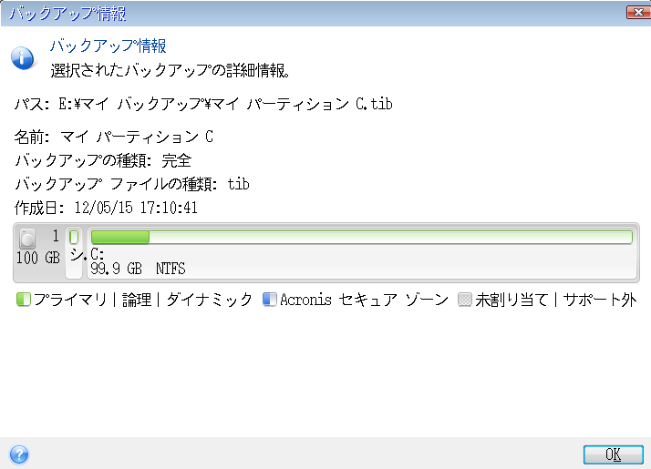 リカバリを続行する前に、既存のすべてのパーティションのサイズと物理的な順序を把握しておく必要があります。この情報を表示するには、ウィザードのツールバーで [詳細] をクリックします。True Image 2013 にバックアップの情報が表示されます。この情報には、ディスクに格納されているすべてのパーティションおよびディスク上の物理的順序の図が含まれます。
