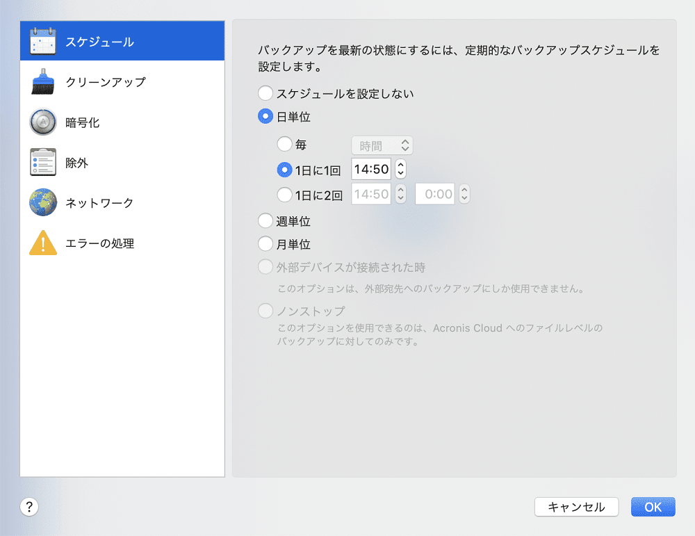1日に1度または2度、指定の時刻または選択した時間間隔でバックアップが開始されます。