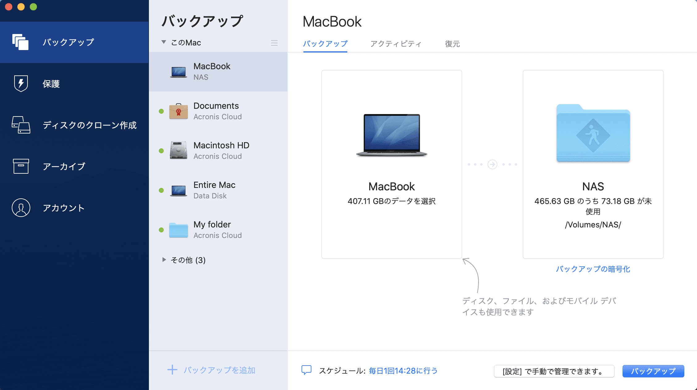 - バックアップ スケジュールを設定するには、[設定] → [スケジュール] の順にクリックします。詳細については、「スケジュール設定」を参照してください。