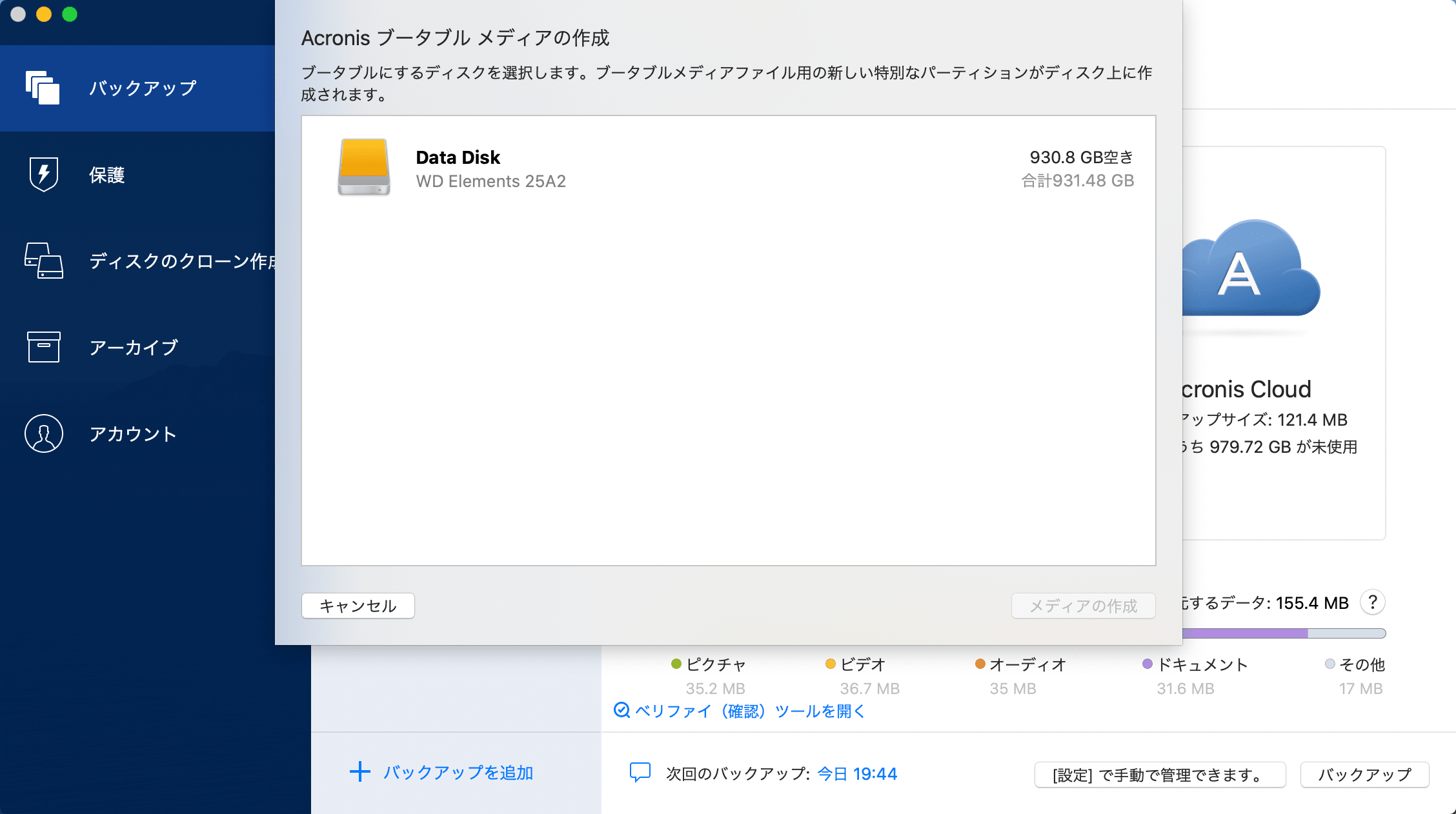 - [ファイル] メニューの [Acronis ブータブルメディアの作成] をクリックします。表示されたウィンドウで、[メディアの作成] をクリックします。