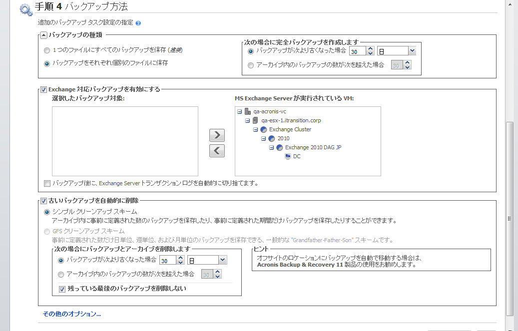 バックアップ作成ウィザード、手順 4: バックアップ方法、[シンプル クリーンアップ] スキーム、保持期間を過ぎたバックアップの削除