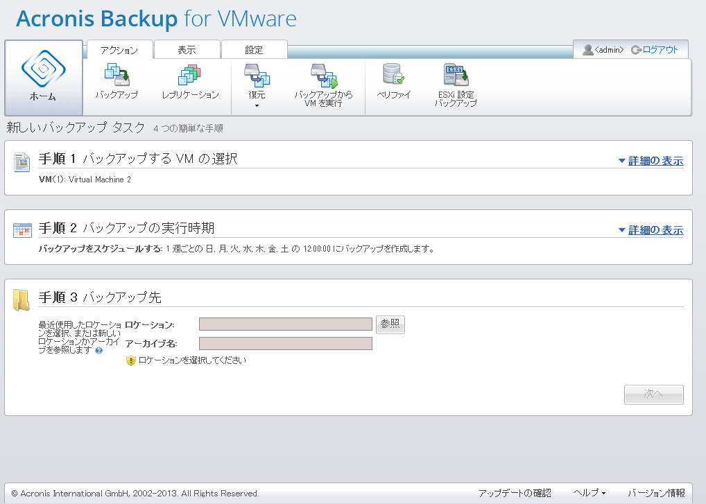 お使いの Backup for VMware エージェントにライセンスが追加されていない場合、バックアップの保存先は Acronis Cloud Backup Storage のみです。