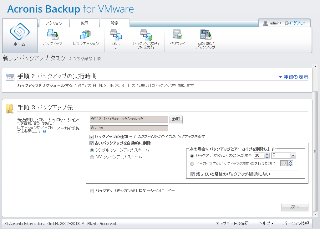 ただし、地域によっては、Acronis Backup for VMware Cloud Backup Storage を使用できない可能性もあります。 詳細については、 http://www.acronis.co.jp/my/cloud-backup/corporate をご覧ください。