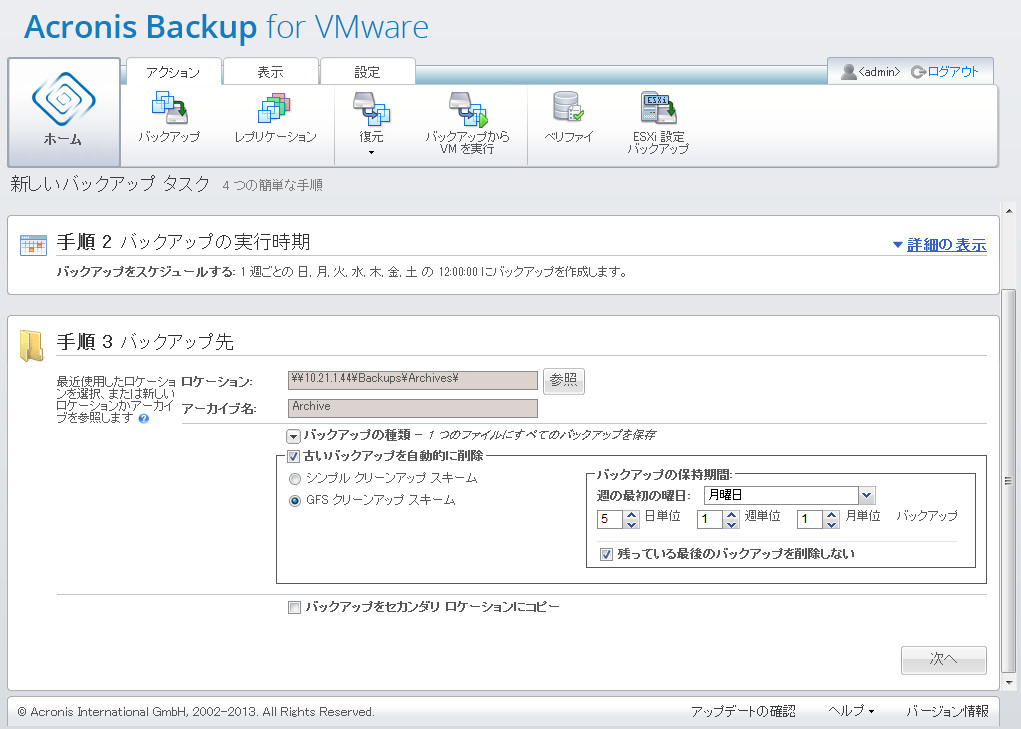 これは、一定の数だけ日単位、週単位、および月単位のバックアップを保存できる、一般的な「Grandfather-Father-Son」スキームです。 保持する必要があるバックアップの数を日単位、週単位、月単位で指定します。 1 日の間に作成されたすべてのバックアップは「日単位」のバックアップとみなされ、データが保存期限切れになるとすべて削除されます。 同じルールが「週単位」のバックアップにも適用されます。