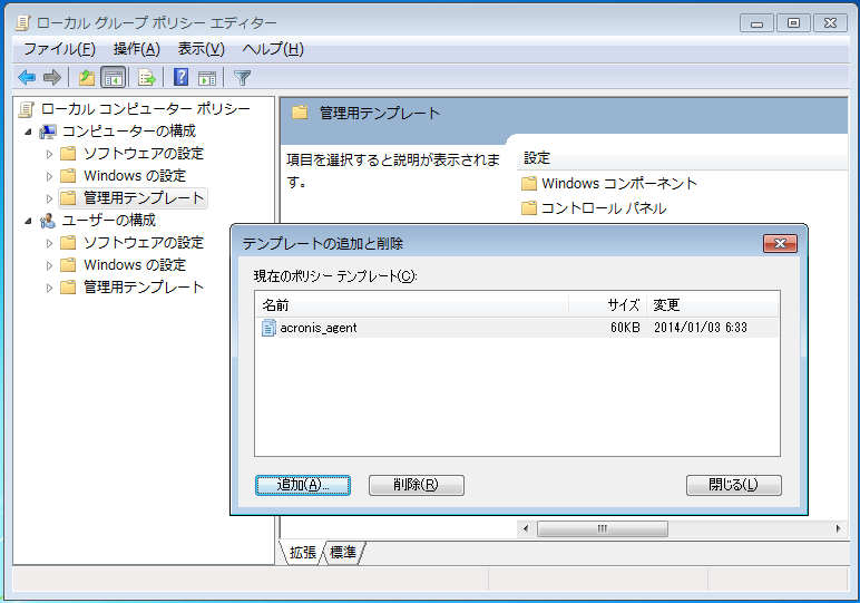 - 32 ビット版 Windows:%CommonProgramFiles%\Acronis\Agent\Acronis_agent.adm または %ProgramFiles%\Acronis\BackupAndRecoveryConsole\Acronis_agent.adm