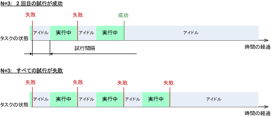 [失敗したタスクを再び開始する] チェック ボックスをオンにし、試行回数と試行の間隔を指定した場合、プログラムによって失敗したタスクが再び実行されます。試行は、試行が正常終了するか、または指定した回数の試行が行われると停止します。