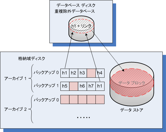 その結果、データストアには一意のデータブロックが大量に格納されます。それぞれのブロックは、1 つ以上のバックアップが参照します。その参照は、重複除外データベースに格納されます。バックアップは一切変更されません。バックアップには、ハッシュ値と重複除外できないデータが保存されます。