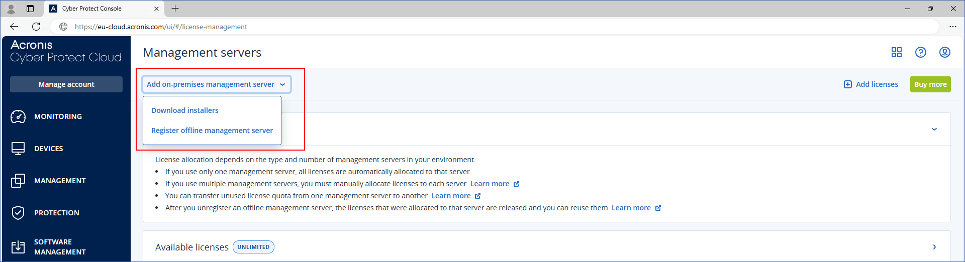 インターネットに接続されているマシンで、クラウドコンソール(https://cloud.acronis.com)にログインし、[設定] > [管理サーバー] に移動します。
