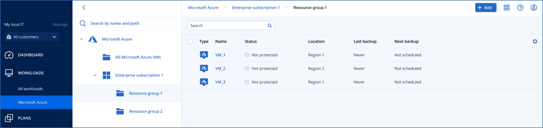 Cyber Protectコンソールで、[デバイス] > [Microsoft Azure] に移動します。現在のAzureエージェントの配置が一覧表示されます。なお、一覧表示された各サブスクリプションでは、階層ツリーの下位に関連するリソースグループが表示されます。