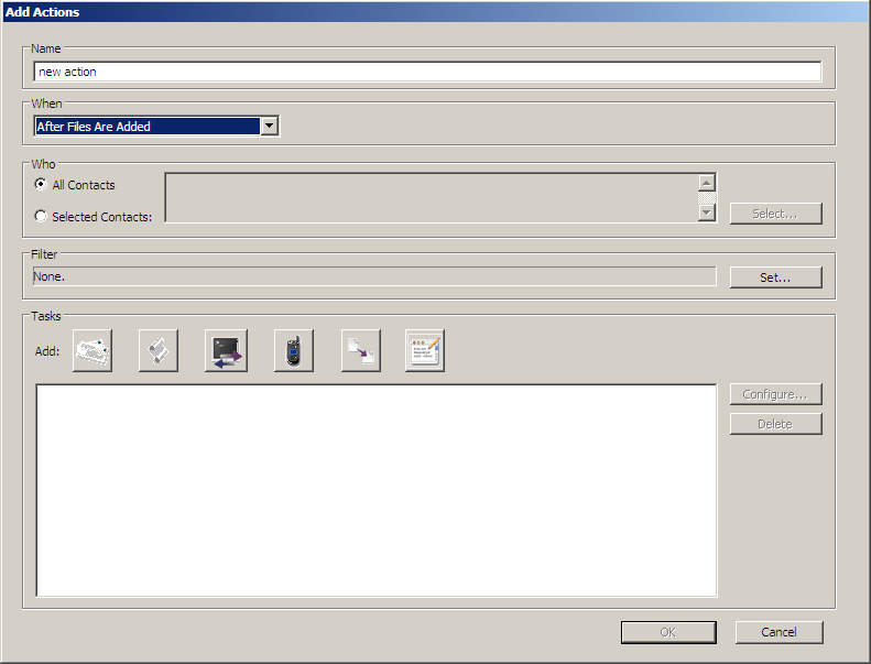 If you click on the Set... button, the Configure Action Filters window appears. In it, you can choose the type of filter you want to set by checking the corresponding check box: