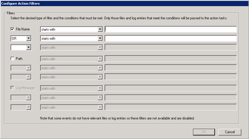 After you have selected a filter type, select the conditions that must be met from the drop-down menu next to the chosen filter. Only those files and log entries that meet the conditions will be passed to the action tasks. The following options are available in the drop-down menu: