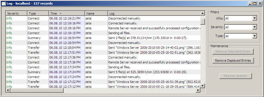 Connect – displays connection entries which show information about the type of the connection (manual or automatic), when a connection has been established/dismantled, and whether the file transfer has began/ended;