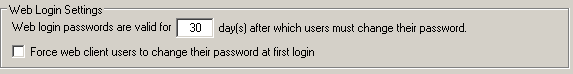 To require Web client contacts to change their password after a set number of days, type the number of days you wish in the field on the Web login passwords are valid for ___day(s) after which users must change their password setting.