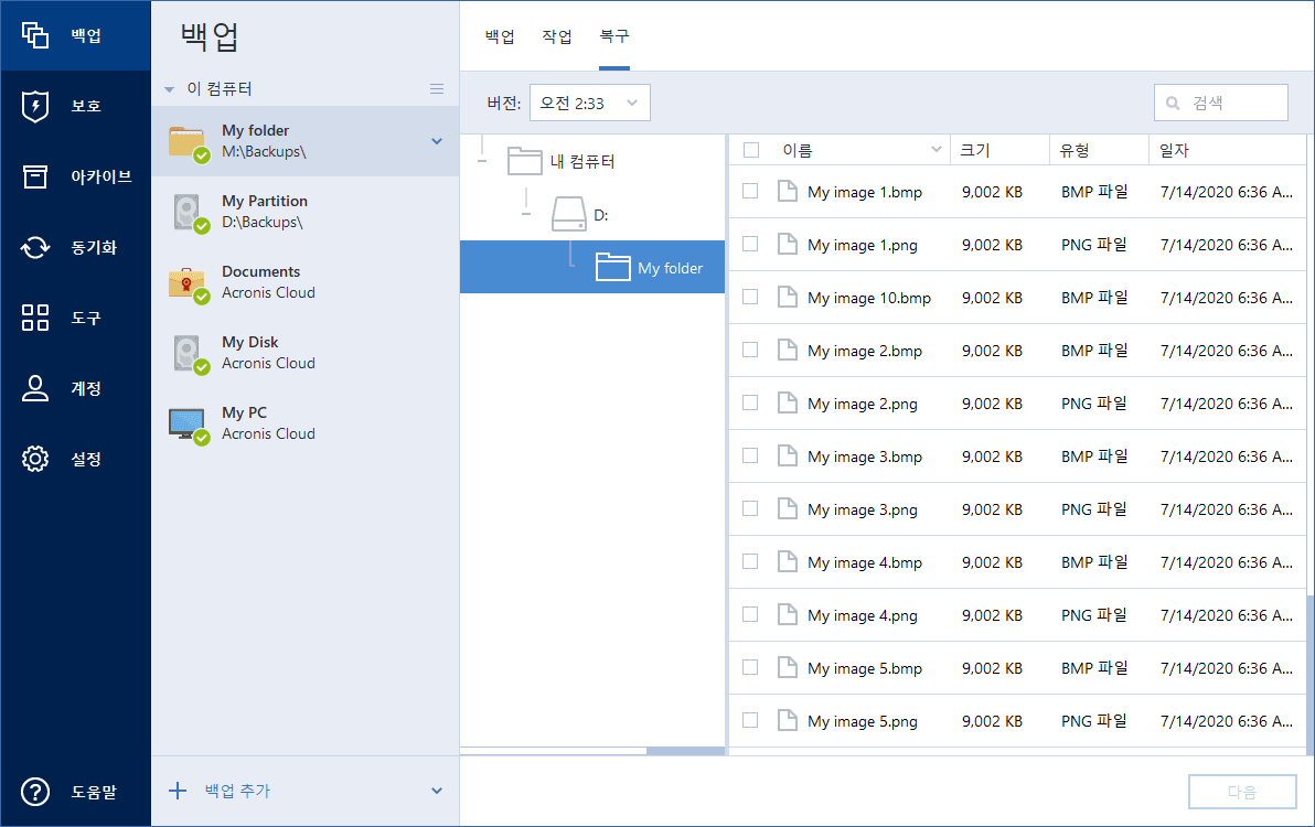 복구하려는 파일 또는 폴더에 해당하는 확인란을 선택하고 다음을 클릭합니다.