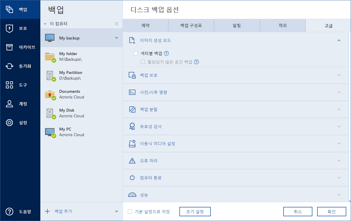수정된 모든 옵션을 처음 제품을 설치한 후 설정된 값으로 재설정하려면 초기값으로 재설정 버튼을 클릭합니다. 그러면 현재 백업의 설정만 재설정됩니다. 향후 모든 백업의 설정을 재설정하려면 초기 설정으로 재설정을 클릭하고 이 설정을 기본값으로 저장 확인란을 선택한 다음 확인을 클릭합니다.