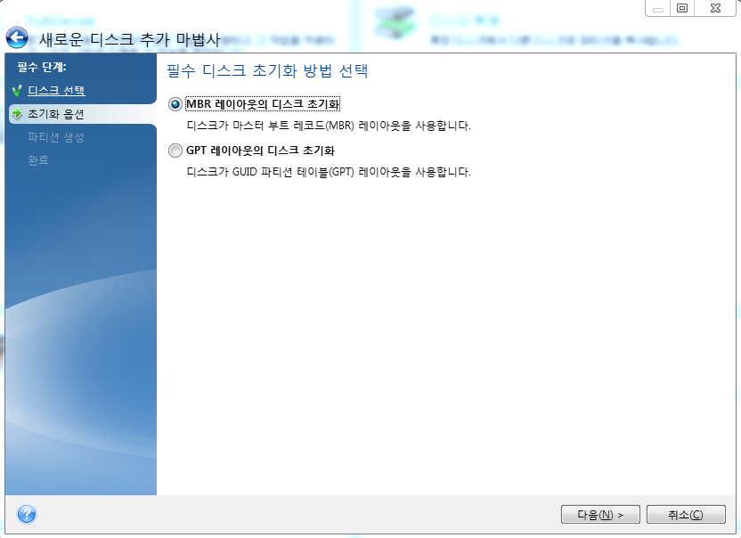 32비트 Windows XP 버전을 사용하고 있는 경우에는 GPT 초기화 방법을 사용할 수 없으므로 초기화 옵션 단계가 제공되지 않습니다.