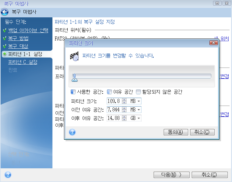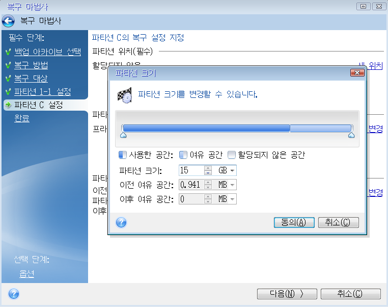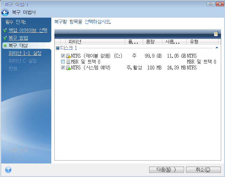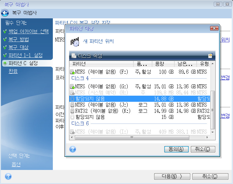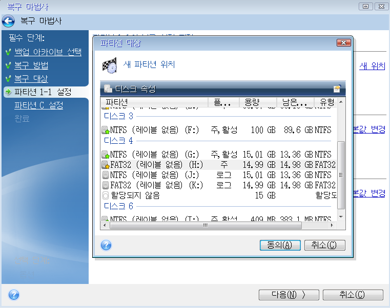 파티션을 선택하면 관련 단계인 "파티션 ...의 설정"이 표시됩니다. 이러한 단계는 지정된 디스크 문자가 없는 파티션(일반적으로 숨겨진 파티션)부터 시작됩니다. 그 다음부터는 파티션 디스크 문자가 오름차순으로 지정됩니다. 이 순서는 변경할 수 없습니다. 이 순서는 하드 디스크 파티션의 실제 순서에 따라 다를 수 있습니다.