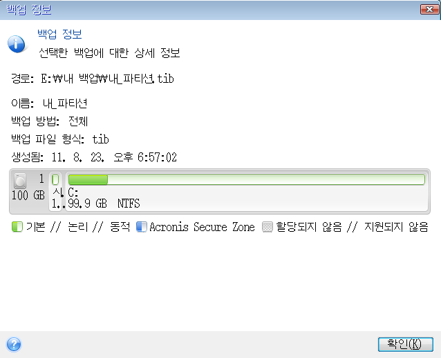 복구를 계속하기 전에 모든 기존 파티션의 크기와 실제 순서를 알아야 합니다. 이 정보를 보려면 마법사 도구 모음에서 상세정보를 클릭합니다. Acronis True Image 2014은(는) 백업에 대한 정보를 표시합니다. 디스크에 포함된 모든 파티션과 디스크에서의 실제 순서를 그래픽으로 보여줍니다.