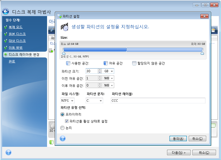 이전 여유 공간, 파티션 크기, 이후 여유 공간 필드에 값을 입력하고 파티션 경계 또는 파티션 자체를 끌어 수행할 수 있습니다.