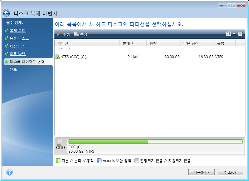 이 창에는 파티션 및 할당되지 않은 공간을 포함하는 원본 하드 디스크를 비롯하여 새로운 디스크 레이아웃을 나타내는 직사각형이 표시됩니다.
