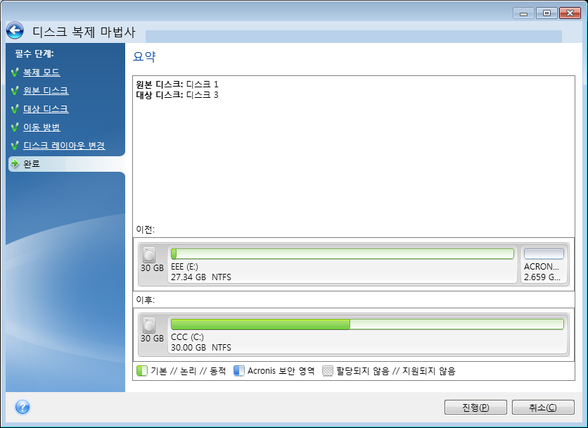 원본 디스크(파티션 및 할당되지 않은 공간) 및 대상 디스크 레이아웃에 대한 정보를 그래픽으로(직사각형) 보여주는 복제 요약 창이 나타납니다. 디스크 번호와 함께 몇 가지 추가 정보 (디스크 용량, 레이블, 파티션 및 파일 시스템 정보)가 제공됩니다.