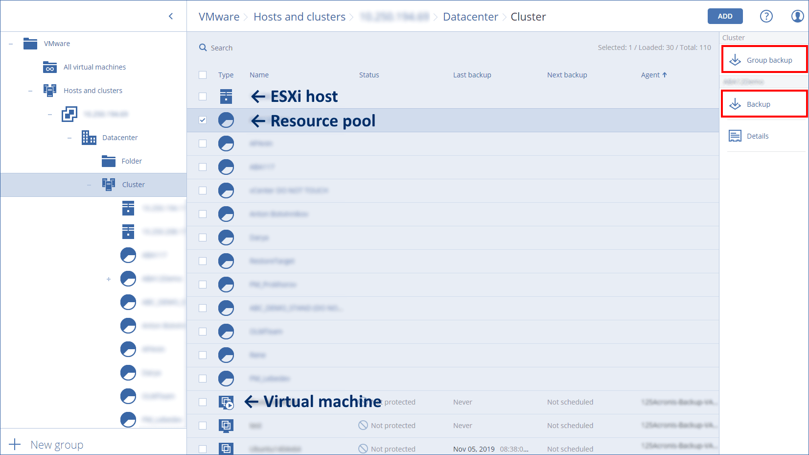 Elk van deze infrastructuurobjecten werkt als een groepsobject voor virtuele machines. Wanneer u een beschermingsschema toepast op een van deze groepsobjecten, wordt er een back-up gemaakt van alle virtuele machines die hierin zijn opgenomen. Klik op Back-up om een back-up te maken van de geselecteerde groepsmachines of klik op Back-up van groep om een back-up te maken van de bovenliggende groepsmachines waarin de geselecteerde groep is opgenomen.
