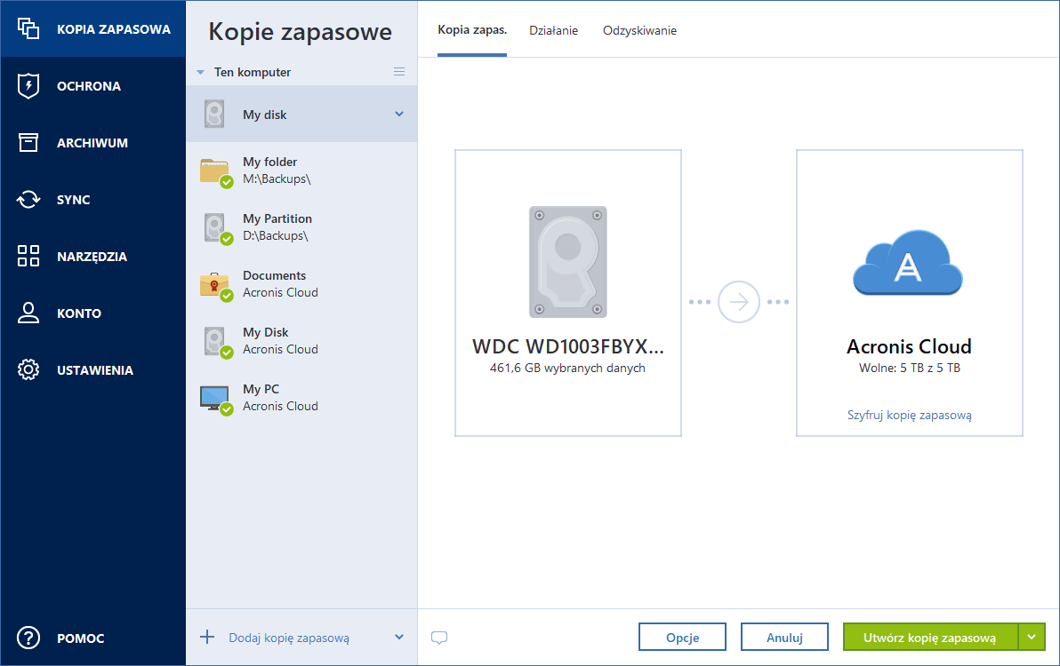 - [krok opcjonalny] Kliknij Opcje, aby ustawić opcje kopii zapasowej. Aby uzyskać więcej informacji, patrz Opcje tworzenia kopii zapasowych.