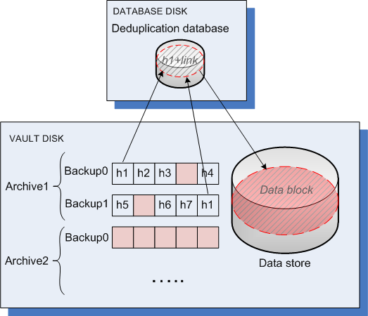 As a result, the data store contains a number of unique data blocks. Each block has one or more references from the backups. The references are contained in the deduplication database. The backups remained untouched. They contain hash values and the data that cannot be deduplicated.