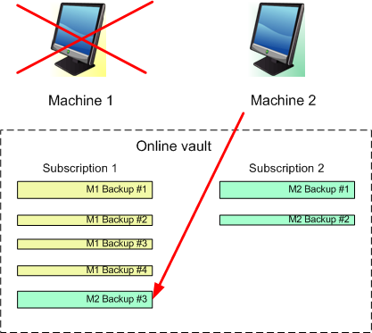 The diagram below shows what happens if you reassign a subscription to a different machine. Let's assume Machine 1 has four backups in Subscription 1. Machine 2 has two backups in Subscription 2. At that point, you reassign Subscription 1 to Machine 2. Machine 2 does its third backup to Subscription 1.