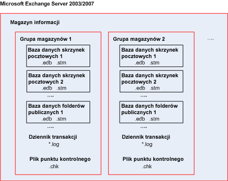 Baza danych programu Exchange 2003/2007 składa się z dwóch plików: .edb na dane tekstowe i .stm na dane MIME.