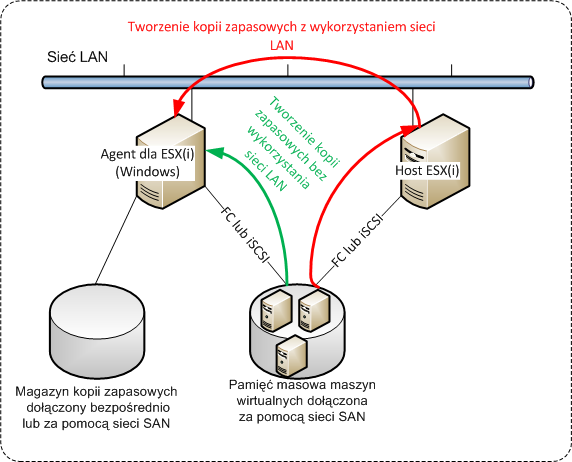 Jeśli system ESX(i) korzysta z magazynu dołączonego za pomocą sieci SAN, zainstaluj agenta na komputerze podłączonym do tej samej sieci SAN. Agent będzie tworzył kopie zapasowe maszyn wirtualnych bezpośrednio z magazynu, a nie z hosta ESX(i) i z sieci LAN. Funkcja ta jest nazywana tworzeniem kopii zapasowych bez obciążania sieci lokalnej.