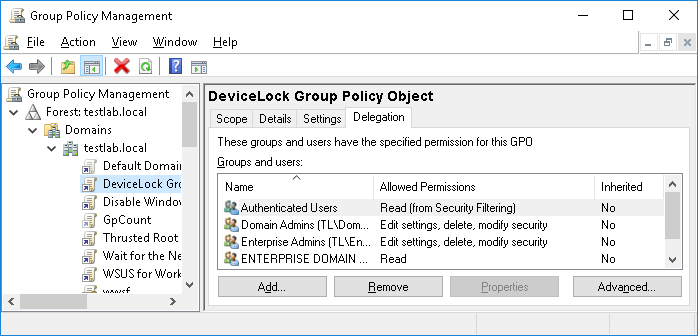 3. In the console tree, select your Group Policy object, click the Delegation tab, and then click Advanced.