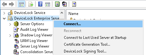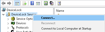 1. Connect DeviceLock Management Console to the computer running DeviceLock Enterprise Server or DeviceLock Content Security Server. Use the Connect command from the shortcut menu available by a right mouse click.