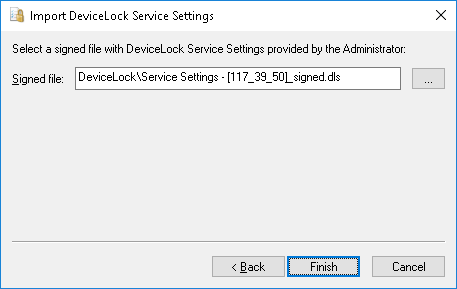 To apply DeviceLock Service settings from a signed file, the user should run the DeviceLock applet in Control Panel and select the Import Service Settings option.